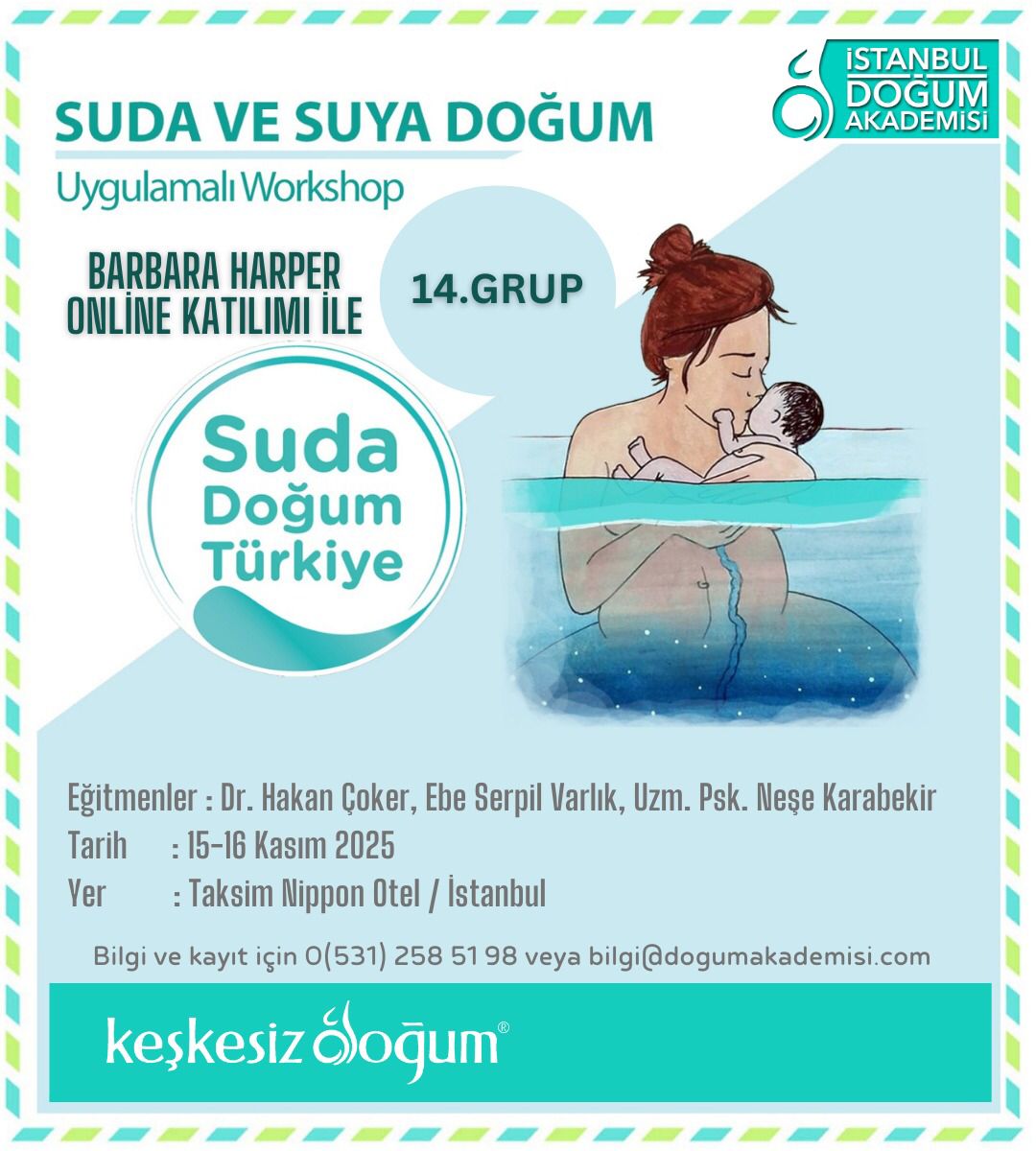 Aktif olarak suda doğuma katılan ekibin sunacağı bu çalışmada, suda doğum ile ilgili tüm teorik ve pratik bilgilerle işlenecek, atölye sonrasında çok kolay bir şekilde uygulamalara başlayabilecek bilgi ve donanıma sahip olunacaktır.